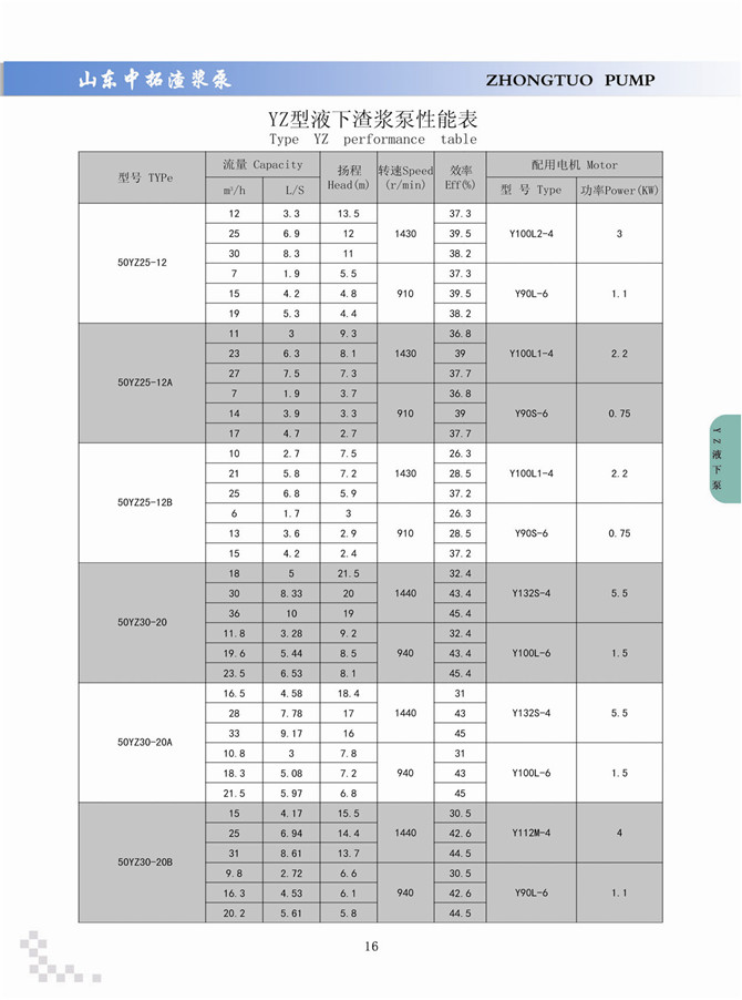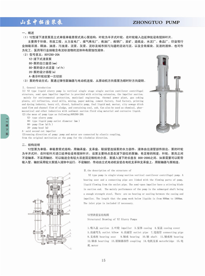 三、結構說明 YS-YZS型(xíng)泵為單級,單吸(xī)懸臂式結構,用(yong)軸承座,支承座(zuo),聯接管連🏃♂️接🌈泵(beng)的水力部件,液(ye)體由出液管部(bù)件排出,泵的葉(ye)輪為半開式葉(yè)輪,在葉輪葉片(piàn)進口延伸處設(shè)有攪拌葉片,該(gāi)泵主要特點是(shi)在液下部位的(de)泵軸,有足夠的(de)剛度,葉㊙️輪,泵殼(ke)之間不設軸承(cheng),不采用軸封,可(kě)以輸送含有較(jiào)大濃度固體顆(kē)粒的介質。泵😍插(chā)入液下的長度(dù)在600—3000之間,如果🈲需(xū)要可以配帶吸(xī)入管。